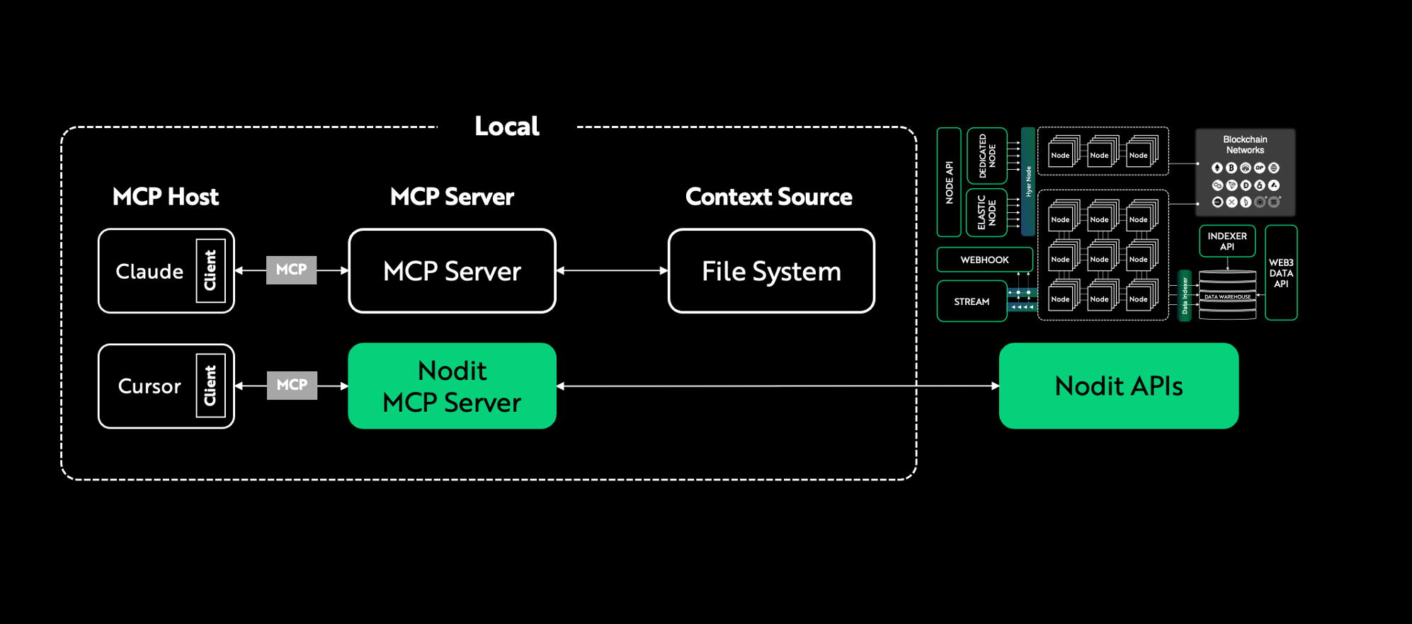 Nodit MCP(Model Context Protocol) 는 이러한 요구에서 출발한 기능으로, AI 기반 서비스가 블록체인 인프라와 직접 연결되어 실시간 온체인 데이터를 구조화된 문맥(context) 으로 이해할 수 있도록 돕는 연결 계층입니다. MCP는 노딧의 Web3 데이터 API와 노드 인프라 위에서 동작하며, AI가 블록체인 데이터를 ‘학습 대상’이 아닌 ‘실시간 입력 정보’로 활용할 수 있게 합니다.